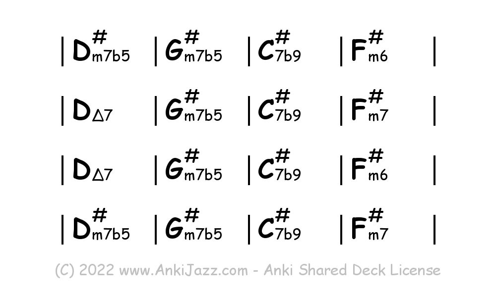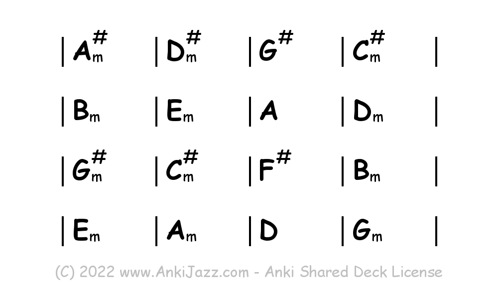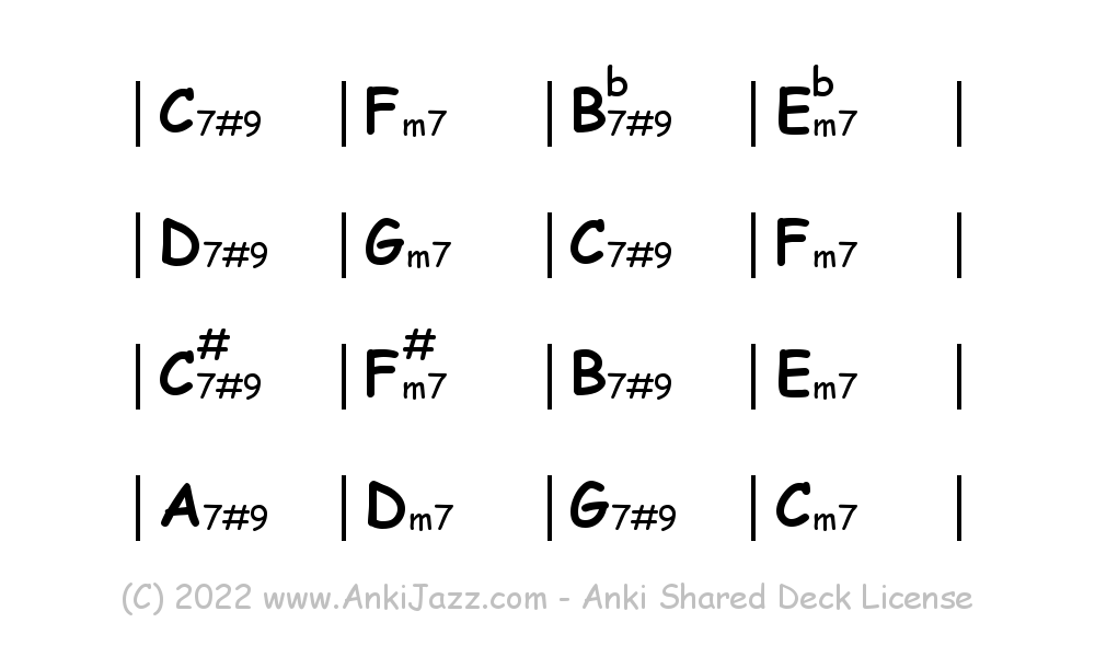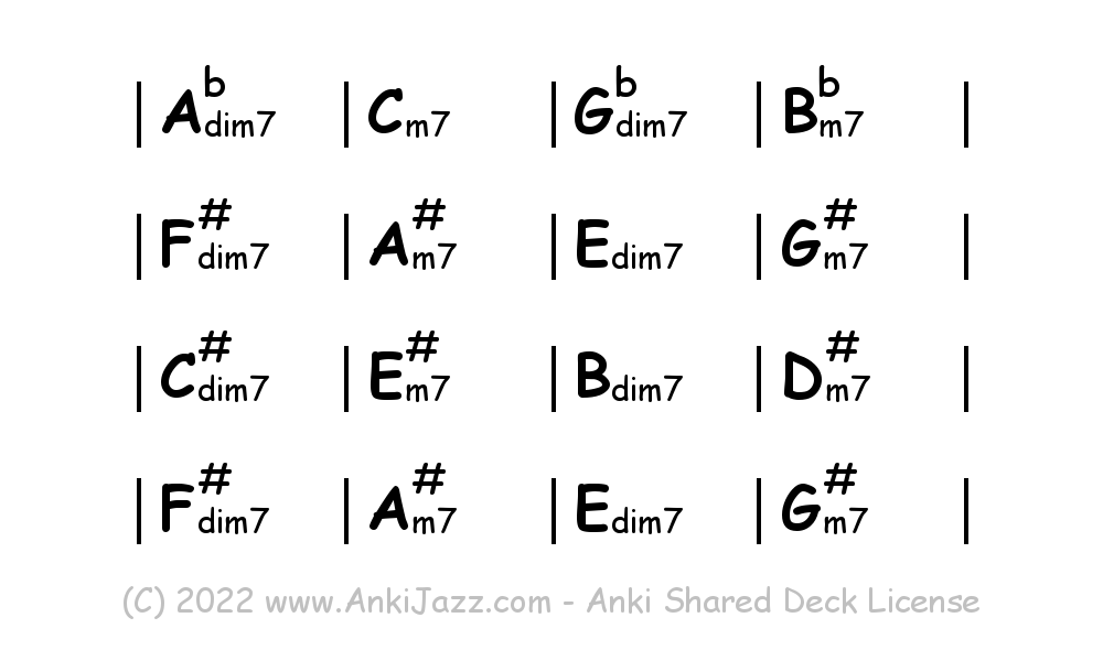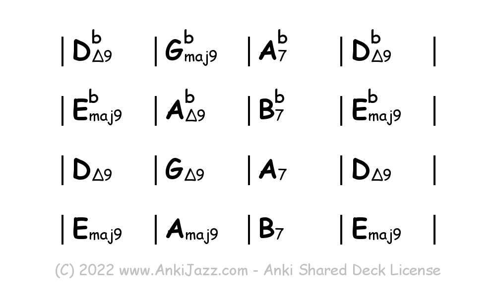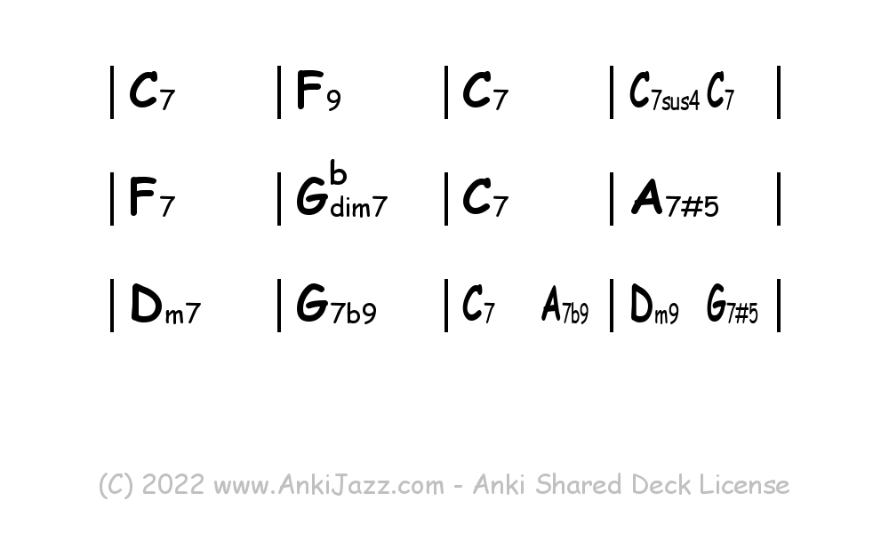 This deck contains chords and chord progressions commonly used in Jazz and other music styles. See full documentation on AnkiJazz.com.