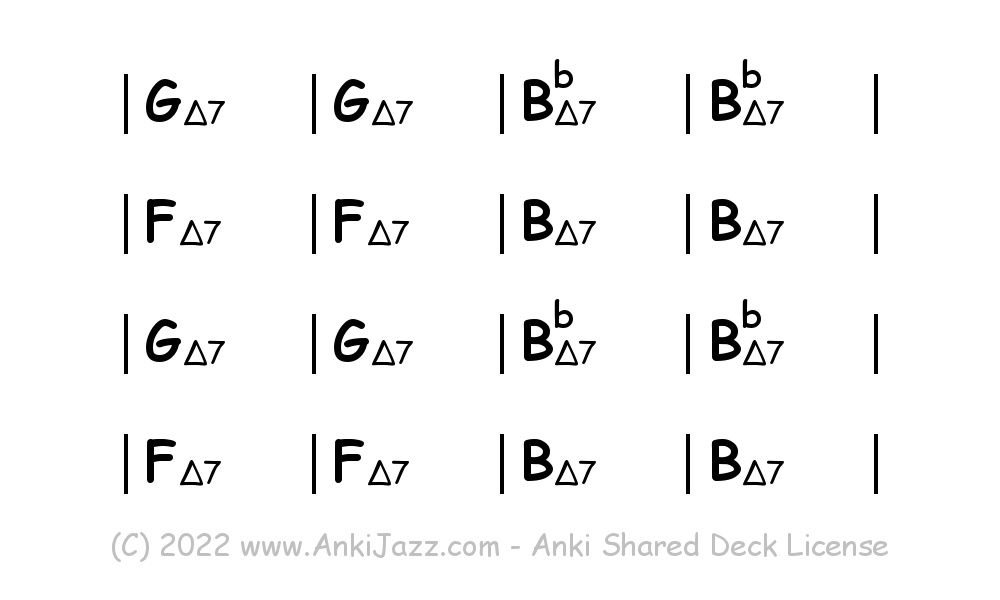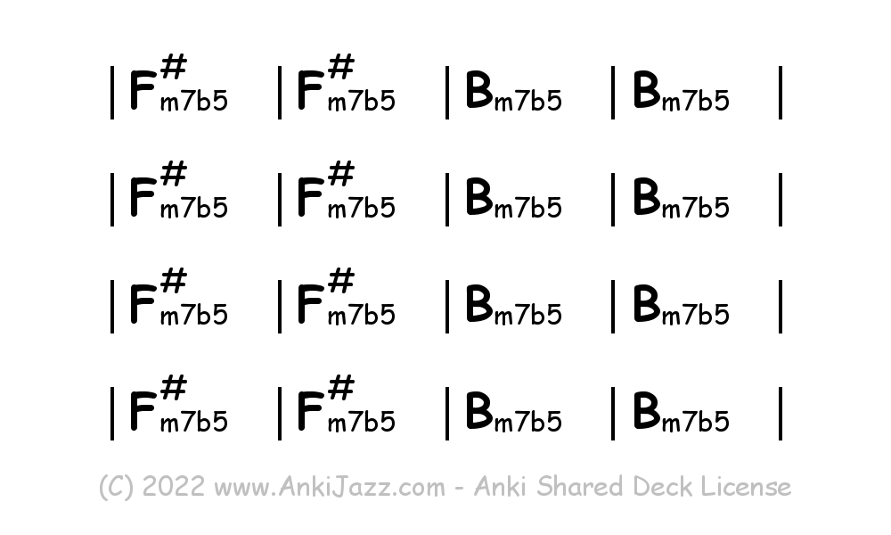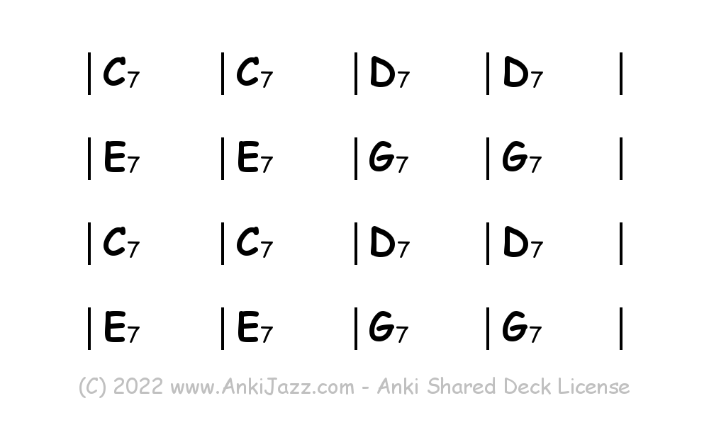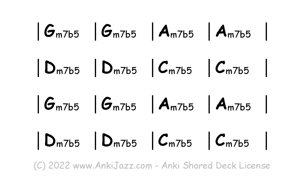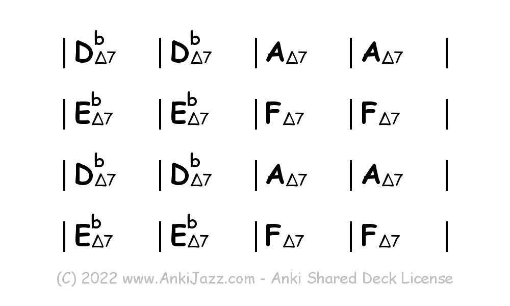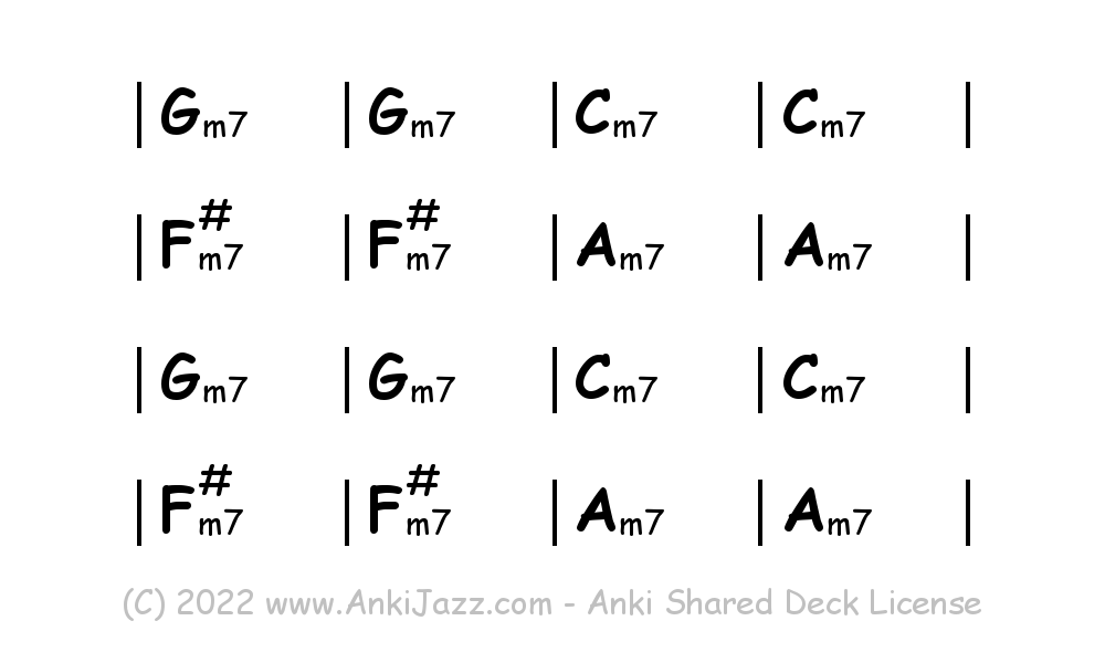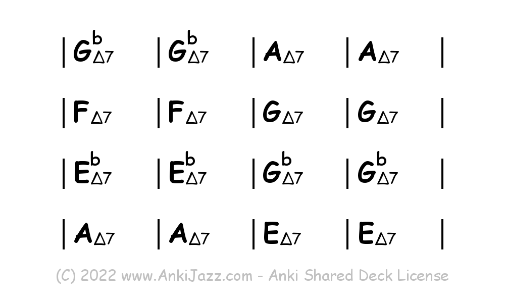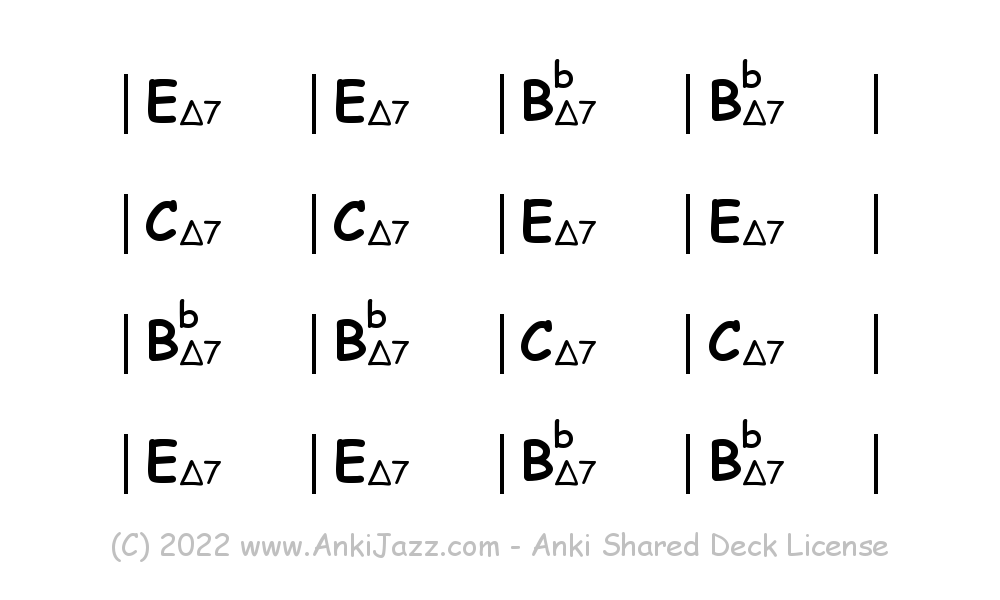 This deck contains chords and chord progressions commonly used in Jazz and other music styles. See full documentation on AnkiJazz.com.