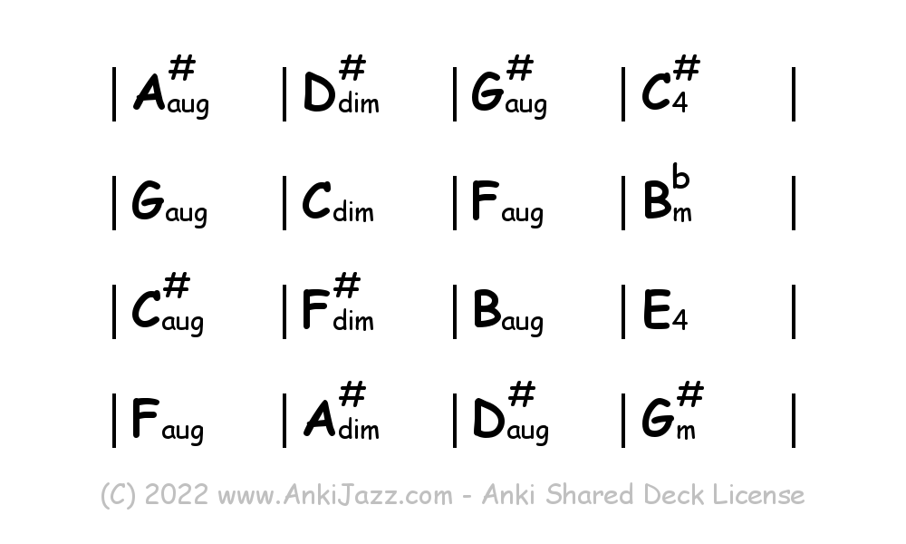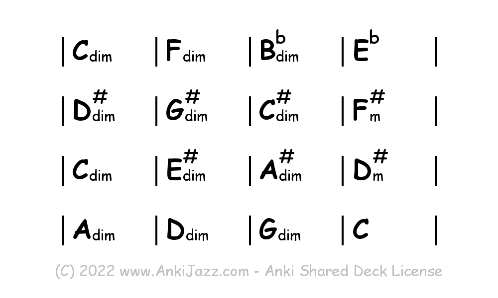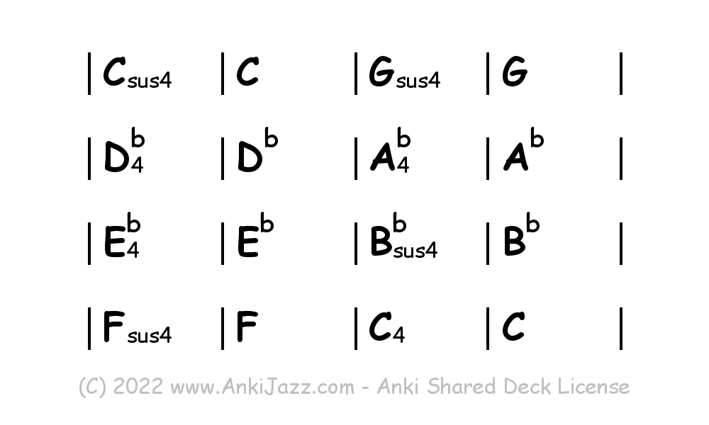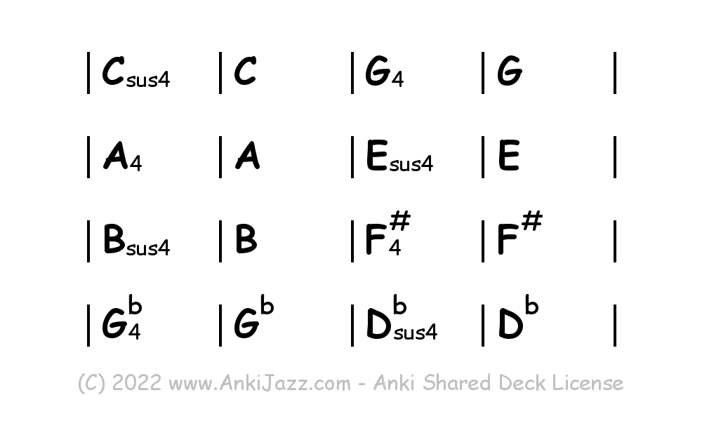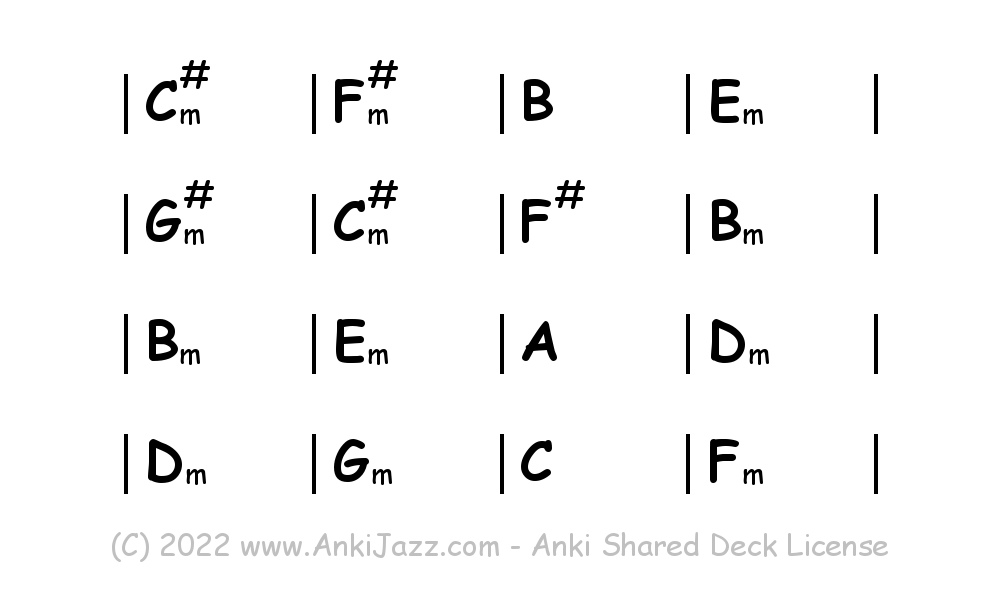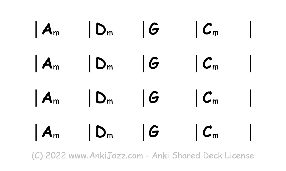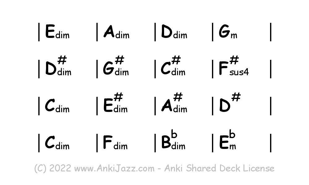 This deck contains chords and chord progressions commonly used in Jazz and other music styles. See full documentation on AnkiJazz.com.